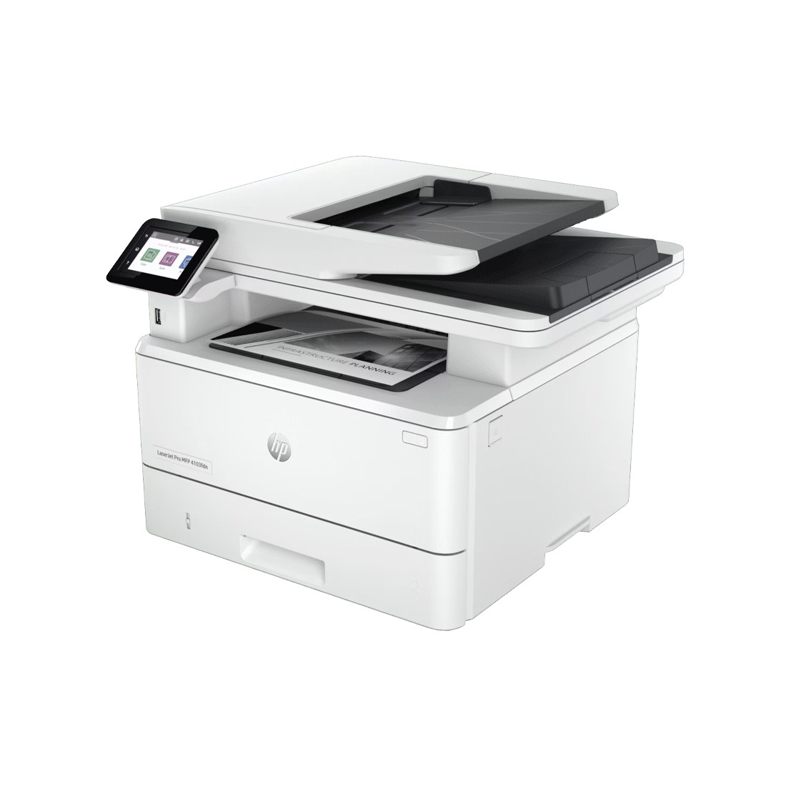The HP LaserJet Pro MFP 4103fdn is a powerful all-in-one monochrome printer built for office productivity. With print, scan, copy, and fax functions, it features LAN connectivity, automatic duplex printing, and an ADF for smooth document handling. It delivers fast print speeds of 40 ppm and comes with a 3,050-page black toner included.