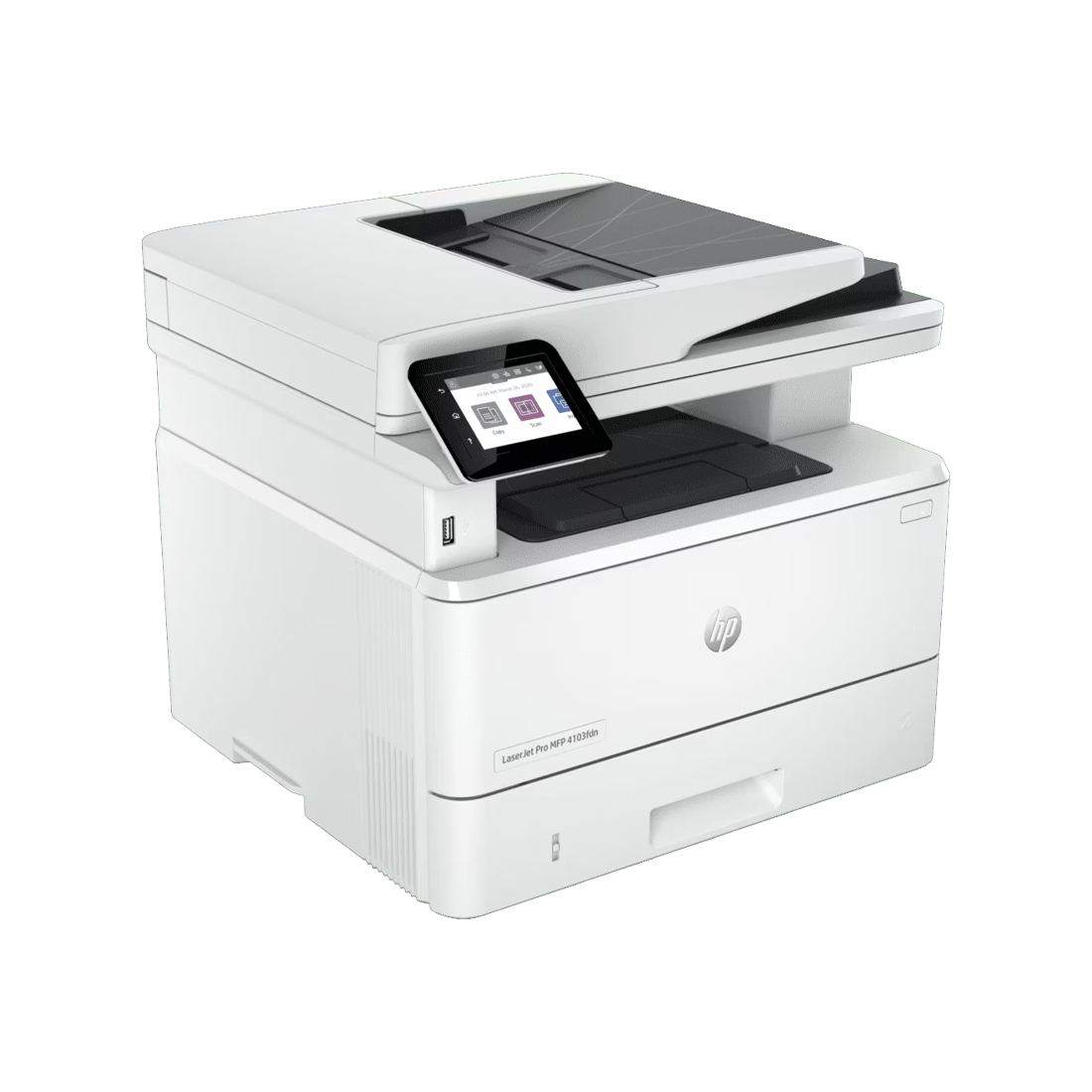 The HP LaserJet Pro MFP 4103fdn is a powerful all-in-one monochrome printer built for office productivity. With print, scan, copy, and fax functions, it features LAN connectivity, automatic duplex printing, and an ADF for smooth document handling. It delivers fast print speeds of 40 ppm and comes with a 3,050-page black toner included.